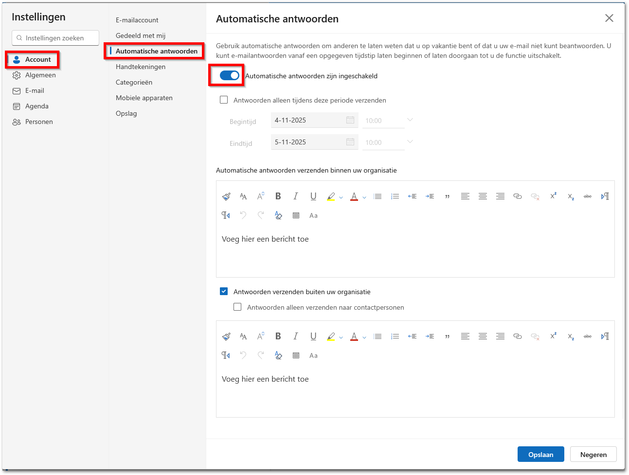 - Typ je interne en externe automatische antwoord. (Als je een van de vakken leeg laat wordt daar geen bericht heen gestuurd)